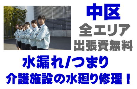 / 中区福祉施設シャワー修理 / 中区介護施設シンク水漏れ / 中区特別養護老人ホーム蛇口水漏れ / 中区老健施設排水パイプつまり / 中区サ高住キッチン排水修理