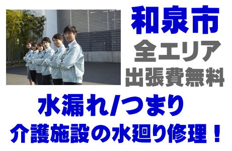 / 和泉市サ高住止水栓交換 / 和泉市老健施設排水管清掃 / 和泉市特養施設水道工事業者 / 和泉市介護施設水道修理店 / 和泉市高齢者住宅シンクパイプ修理