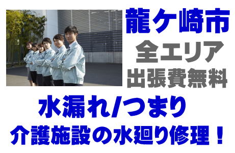 / 龍ケ崎市老人ホームシンク水漏れ / 龍ケ崎市高齢者施設蛇口水漏れ / 龍ケ崎市介護医療院ポンプ交換 / 龍ケ崎市デイサービス排水パイプつまり