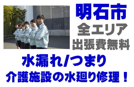 / 明石市福祉施設シャワー修理 / 明石市介護施設シンク水漏れ / 明石市特別養護老人ホーム蛇口水漏れ / 明石市老健施設排水パイプつまり /