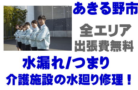 / あきるの野市老人ホームシンク水漏れ / あきるの野市高齢者施設蛇口水漏れ / あきるの野市介護医療院ポンプ交換 / あきるの野市デイサービス排水パイプつまり