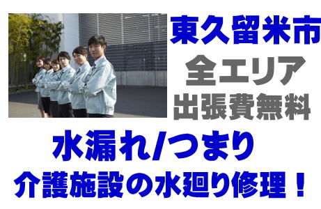 / 東久留米市老人ホームシンク水漏れ / 東久留米市高齢者施設蛇口水漏れ / 東久留米市介護医療院ポンプ交換 / 東久留米市デイサービス排水パイプつまり