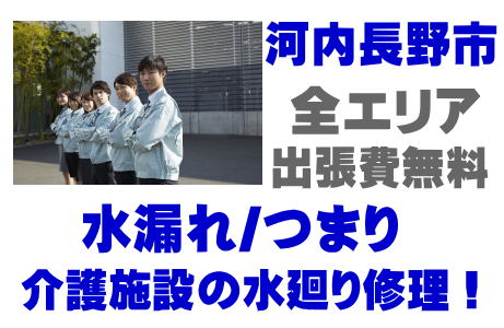/ 河内長野市老人ホームシンク水漏れ / 河内長野市高齢者施設蛇口水漏れ / 河内長野市介護医療院ポンプ交換 / 河内長野市デイサービス排水パイプつまり