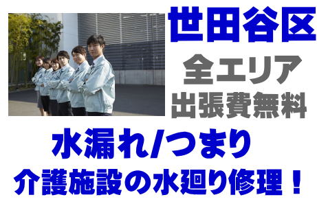 / 世田谷区老人ホームシンク水漏れ / 世田谷区高齢者施設蛇口水漏れ / 世田谷区介護医療院ポンプ交換 / 世田谷区デイサービス排水パイプつまり